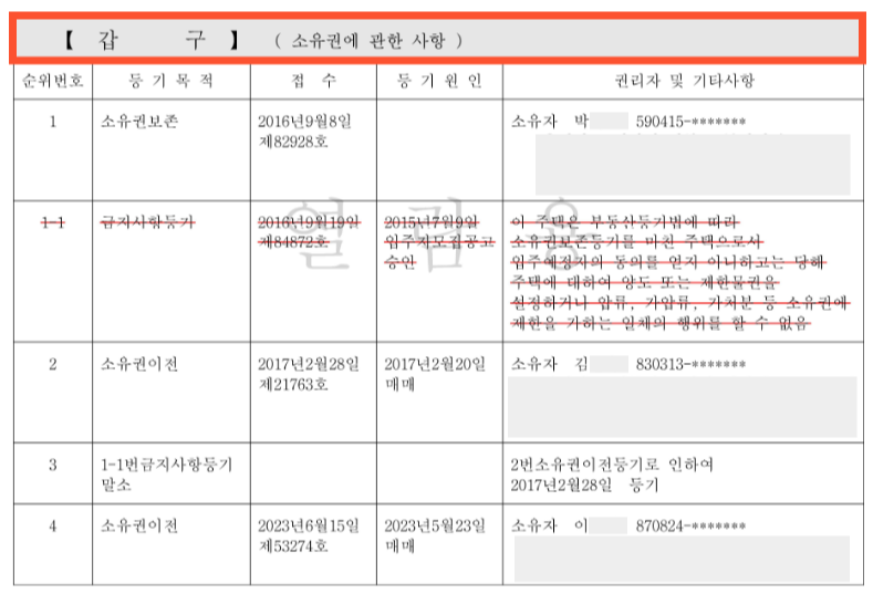 갑구는 소유권에 관한 사항입니다.