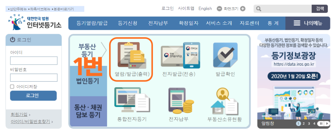1. 인터넷 등기소 홈페이지(http://www.iros.go.kr/)에 접속 후 열람/발급을 눌러줍니다.