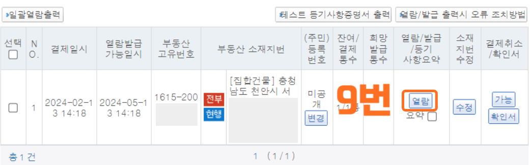 9. 열람을 눌러 등기부등본을 열람하시면 모든 과정이 끝이 납니다.
