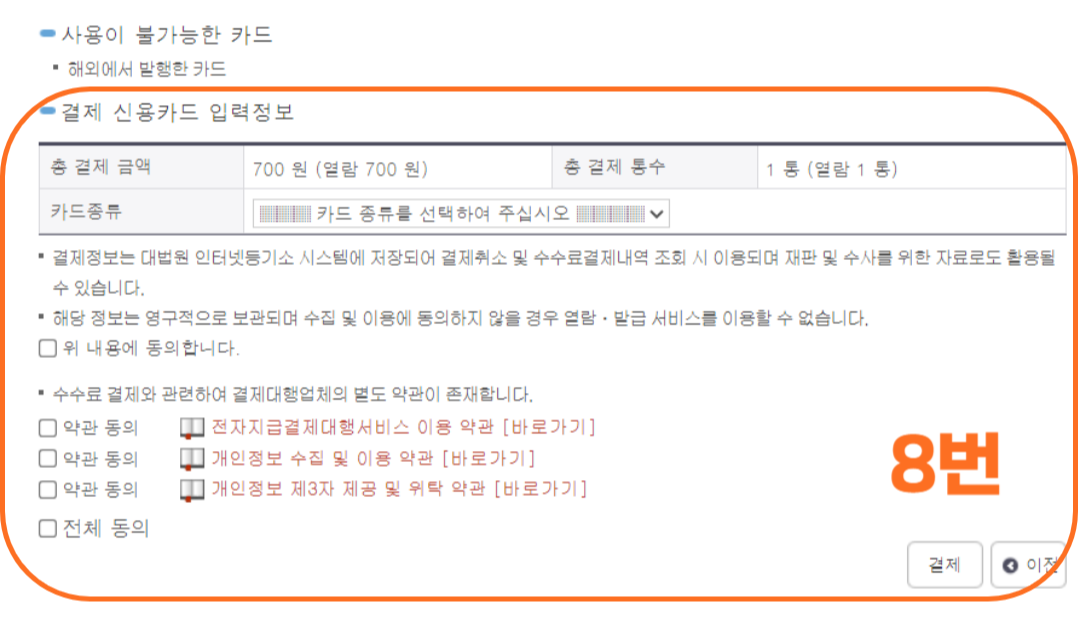 8. 약관에 동의 후 원하는 방식으로 결제를 진행해 줍니다.