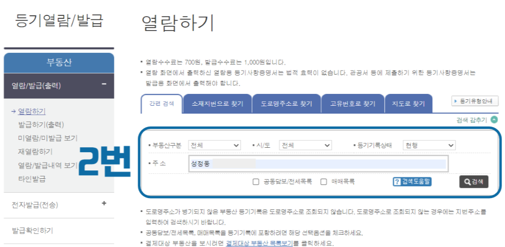 등기 사항 전부 증명서를 발급하는 방법 또한 열람과 동일하게 진행하면 됩니다.
