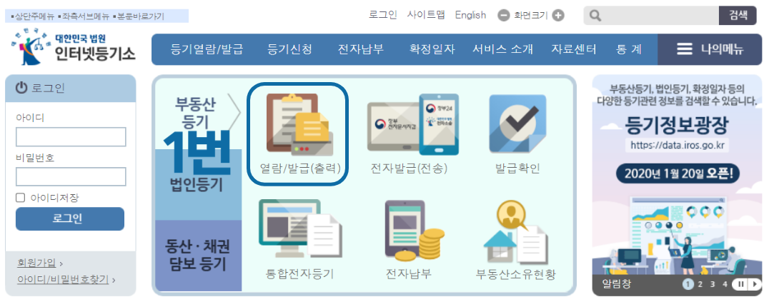1. 먼저 인터넷 등기소(iros.go.kr)에 접속 후 로그인을 합니다. 아이디가 없다면 회원가입을 먼저 해줍니다. 로그인 후 열람/발급(출력)을 클릭합니다.