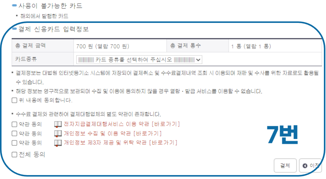 7. 약관 전체동의를 클릭해주고 카드를 선택해 700원을 결제해 줍니다.