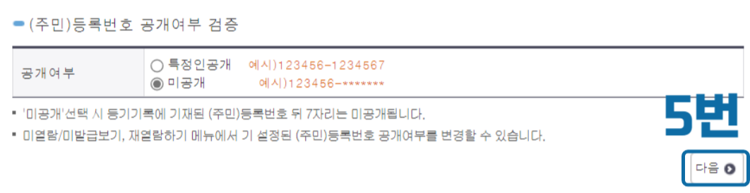 5. 주민등록번호 미공개 선택후 다음을 눌러줍니다.
