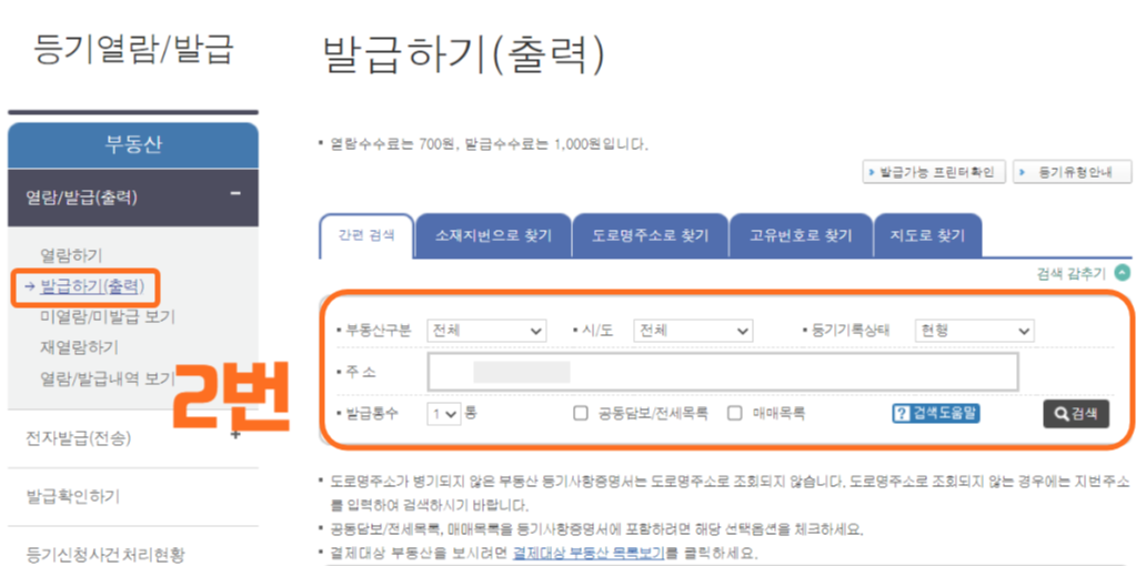 2. 왼쪽 상단 발급하기를 눌러준 후 발급하고 싶은 곳의 주소를 입력해 줍니다.
