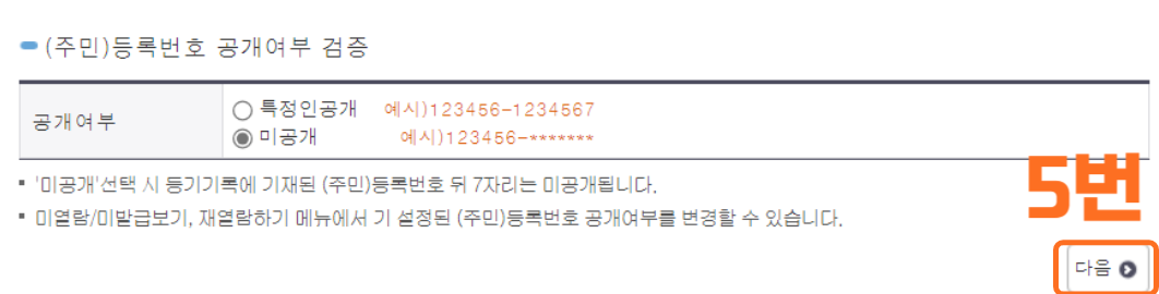 5. 주민등록번호 공개여부를 선택한 후 다음을 눌러줍니다.