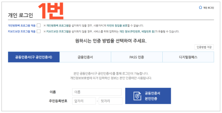 개인 로그인을 하는 경우 공동인증서가 필요하며, 인증서는 PASS인증, 공동인증서, 디지털원패스 중 하나를 택하여 로그인하면 됩니다.