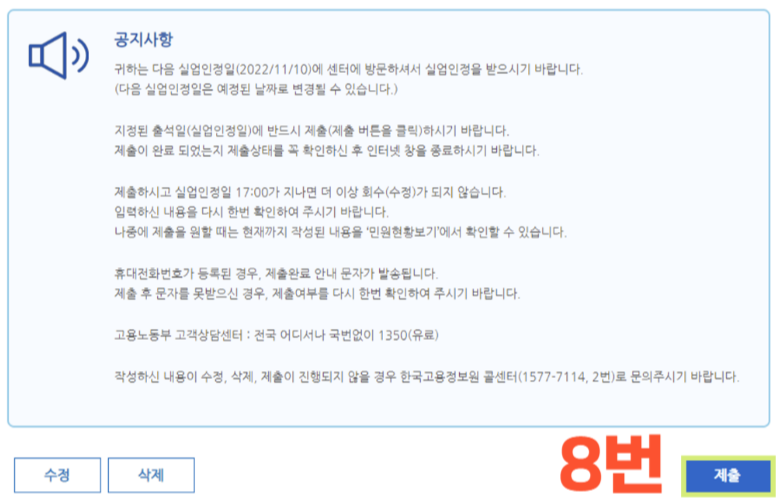 8. 실업급여 신청서 제출은 지정된 출석일만 가능합니다. 실업인정일 당일 00:00 ~ 17:00 사이에만 가능하니 참고해 주시기 바랍니다.