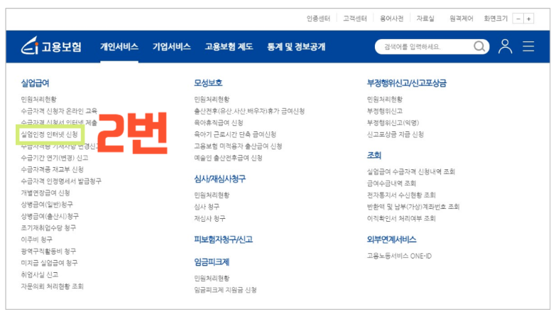 2. 상단의 개인서비스 - 실업인정 인터넷 신청을 클릭해 줍니다.
