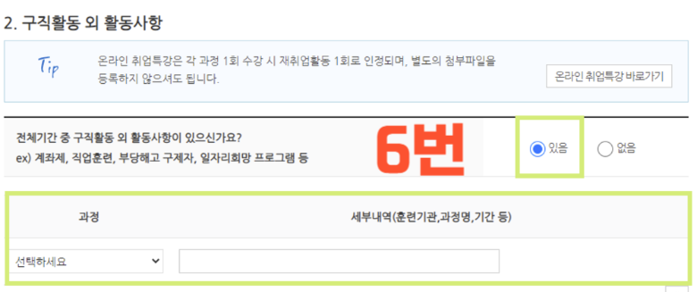 6. 구직 외 활동사항이 있는지 체크하고 필요 항목을 입력해 줍니다.