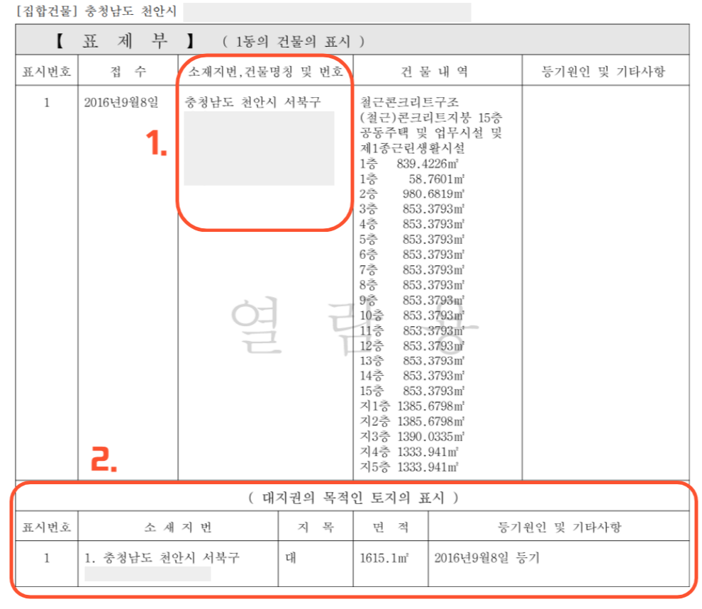 표제부는 건물의 이름이라 생각하면 됩니다. 표제부에서 확인해야 할 점은 건물의 주소가 맞는지, 평수가 맞는지, 그리고 대지권이 설정되어 있는지를 확인하면 됩니다.