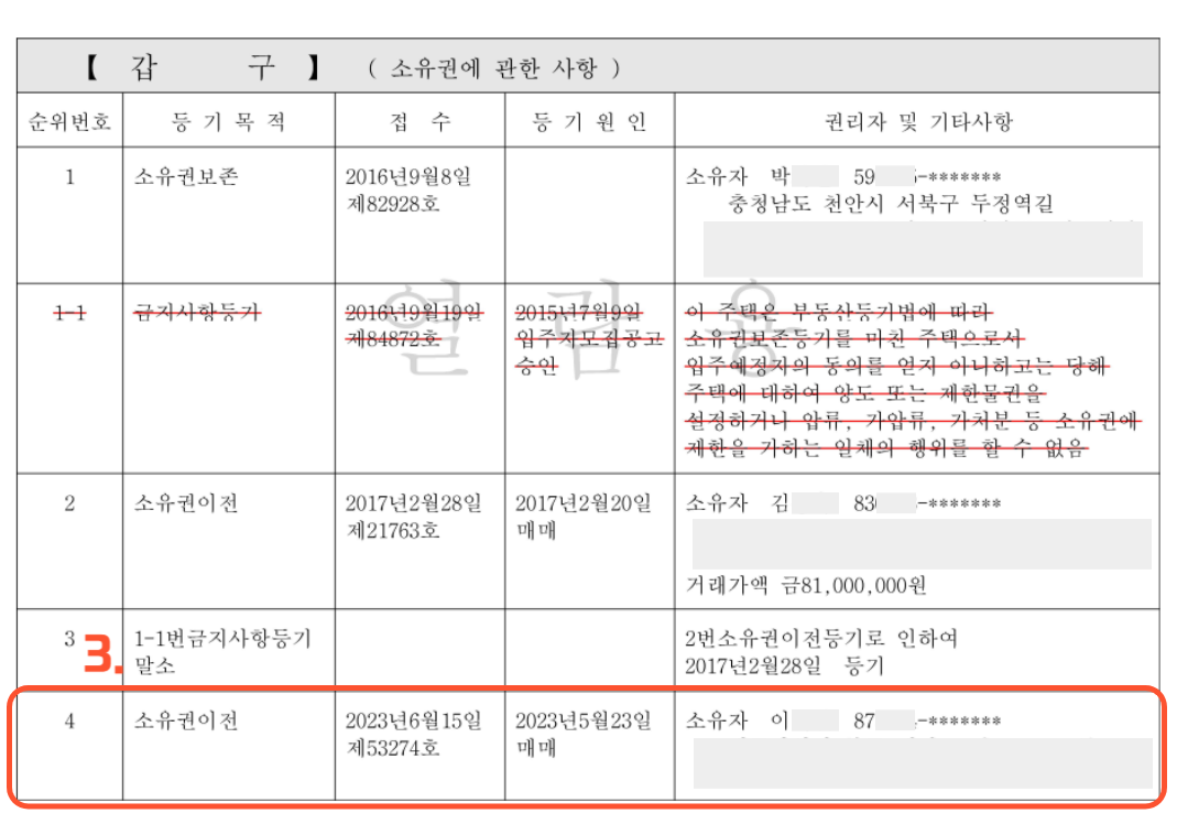 위의 갑구 사진을 보면 이 부동산은 소유권이 2번 이전되었고, 마지막 소유권을 가진 이**씨가 현재 부동산의 주인입니다.