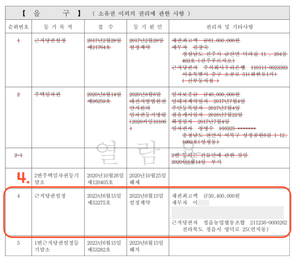 위의 을구 사진을 보면 소유자 이**씨가 해당 물건을 담보로 5천만원을 정읍농협(근저당권자)에서 대출받은 것을 확인할 수 있습니다.
