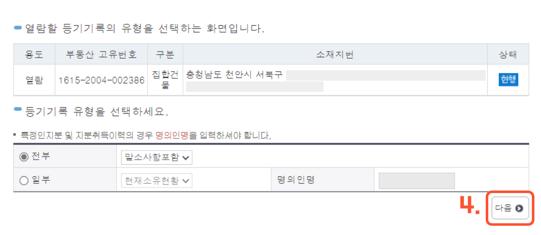 4. 말소사항 포함 후 다음을 클릭합니다.