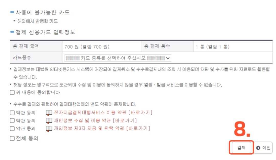 8. 약관에 동의 체크 후 결제를 눌러 700원을 지불합니다.